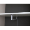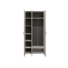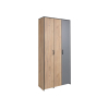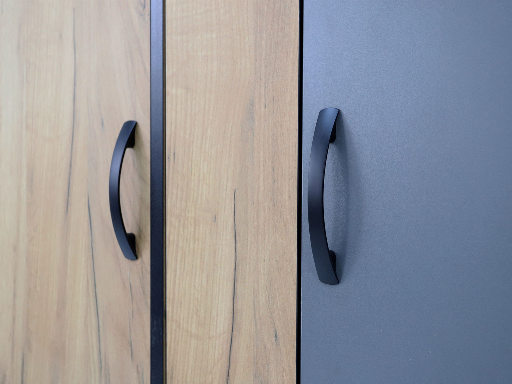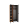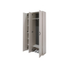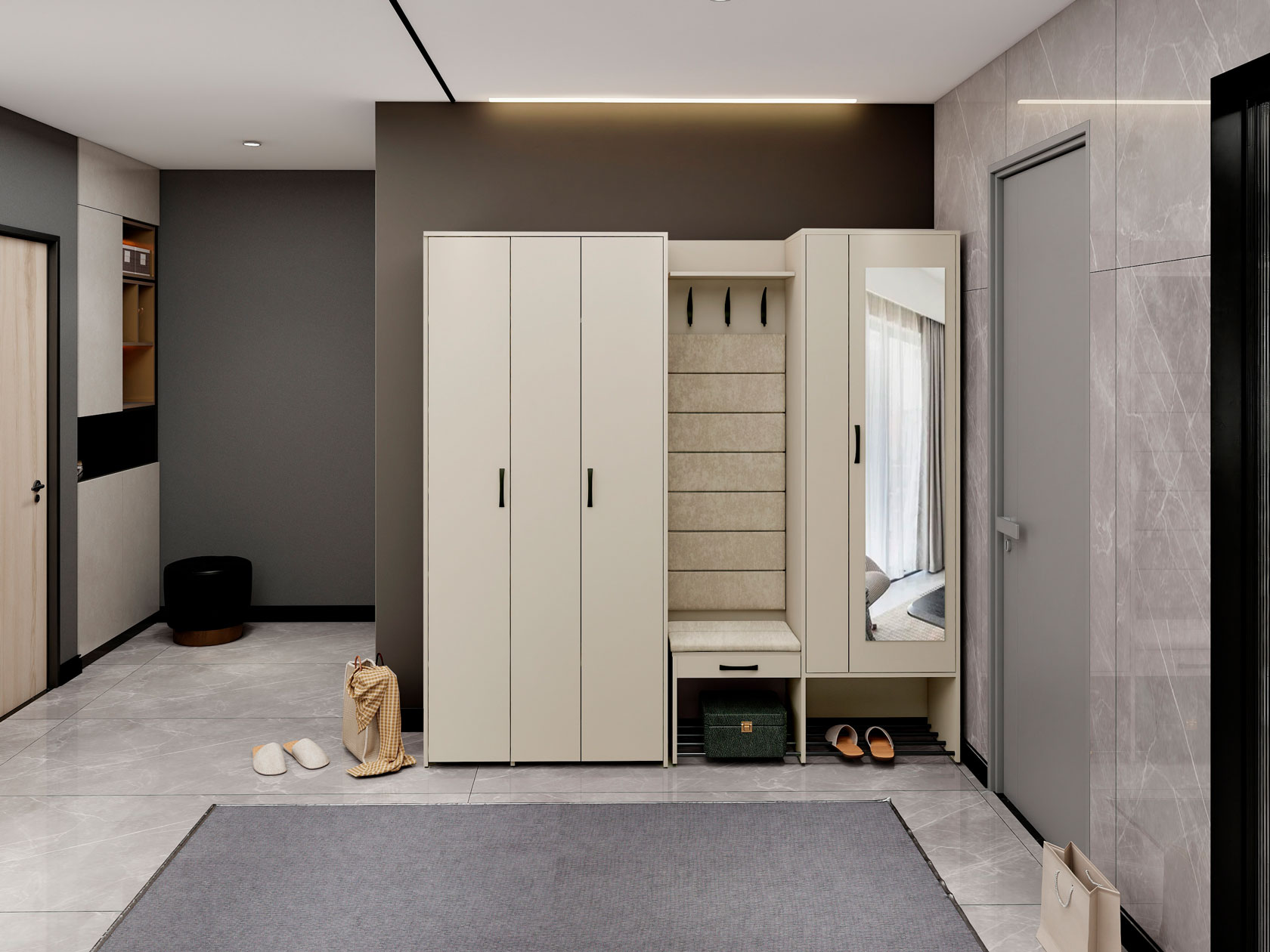 На полках можно разложить джинсы, футболки и домашний текстиль, а в секции со штангой — повесить одежду на вешалках. Открытая ниша внизу оснащена решетками, на которых удобно хранить уличную обувь.