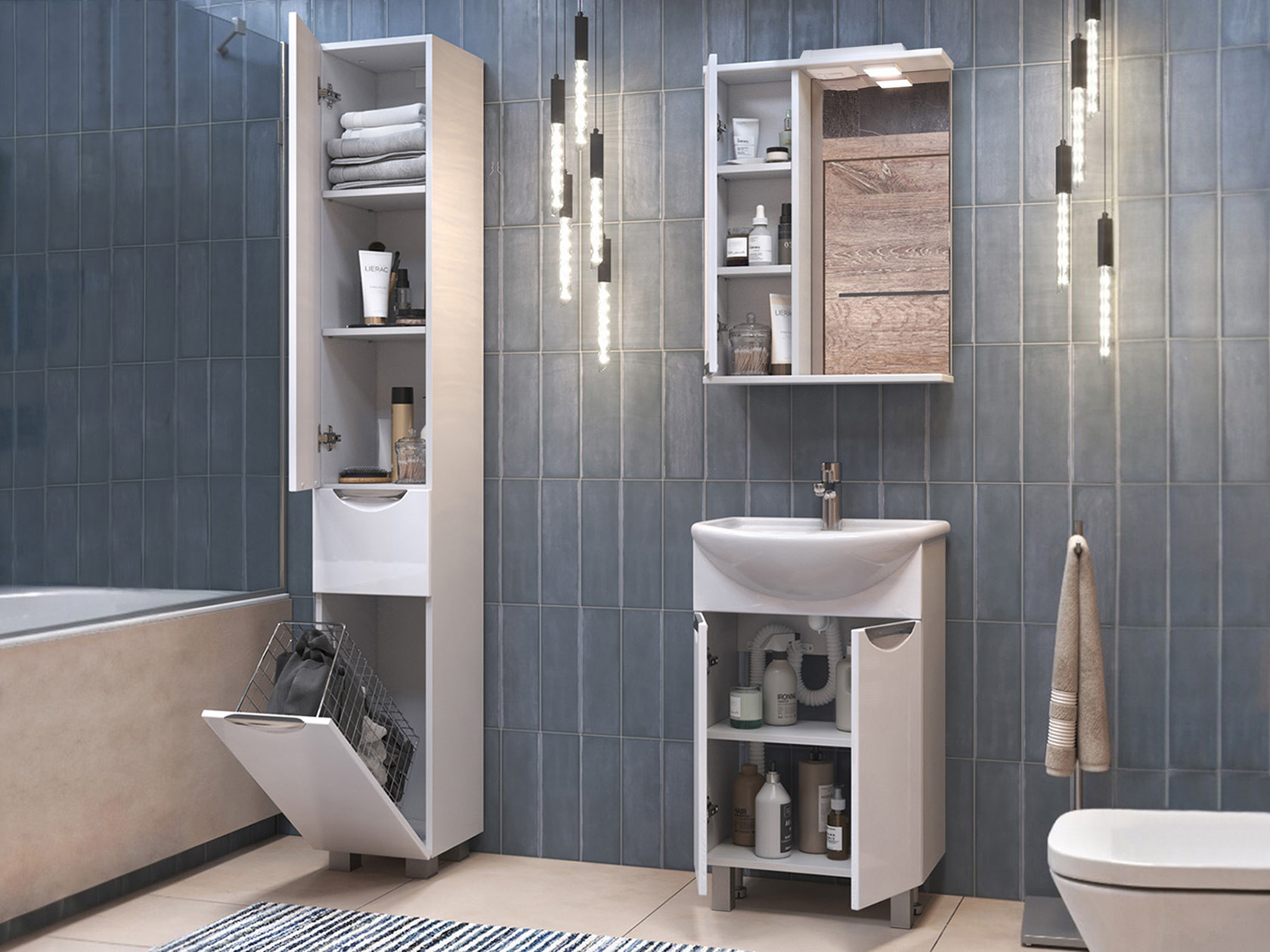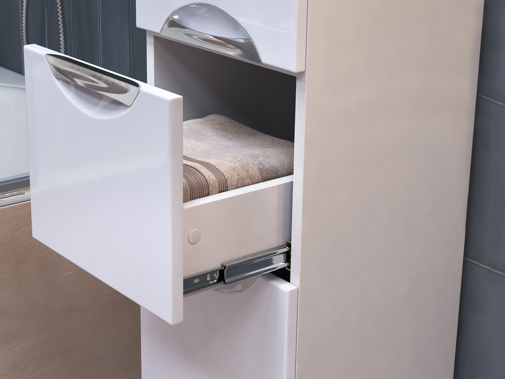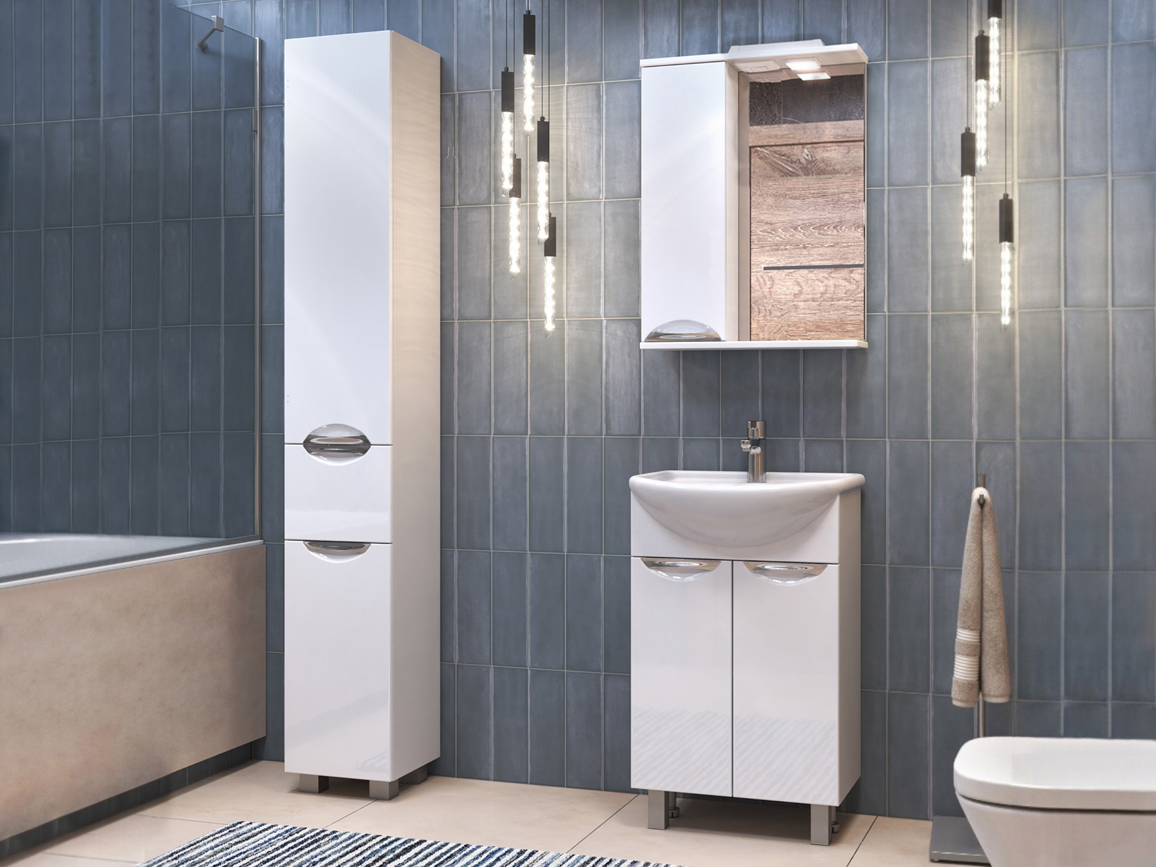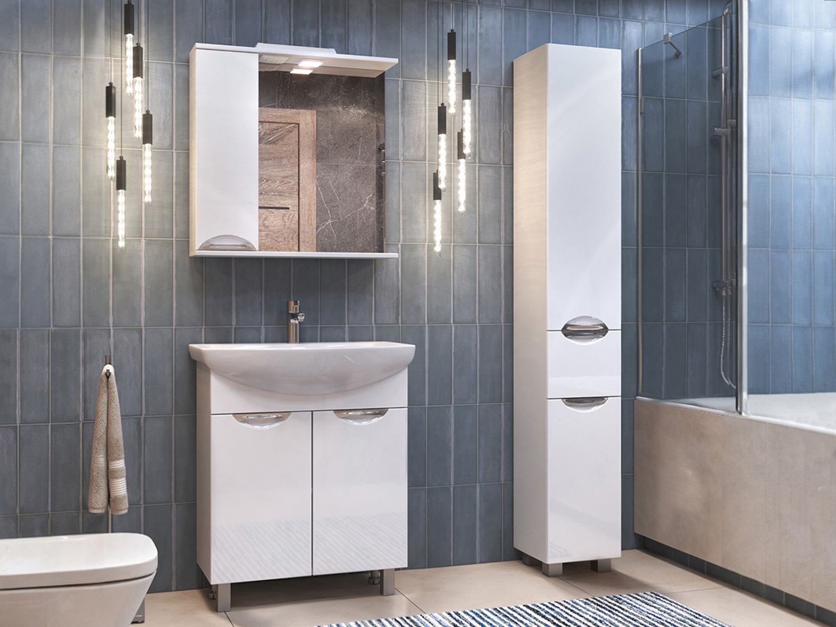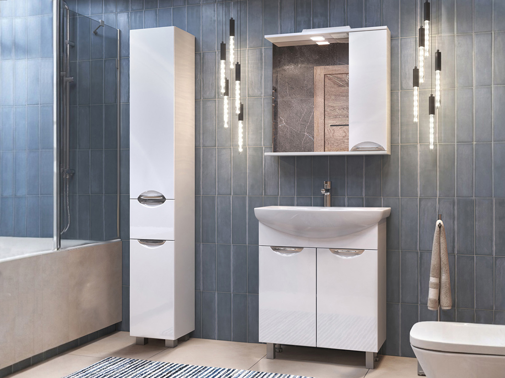 Регулируемые опоры обеспечивают устойчивость на полу с неровностями. Глянцевые фасады отлично выдерживают воздействие влаги и надолго сохраняют презентабельный вид. Хромированные ручки из металла выступают необычными акцентами пространства.