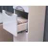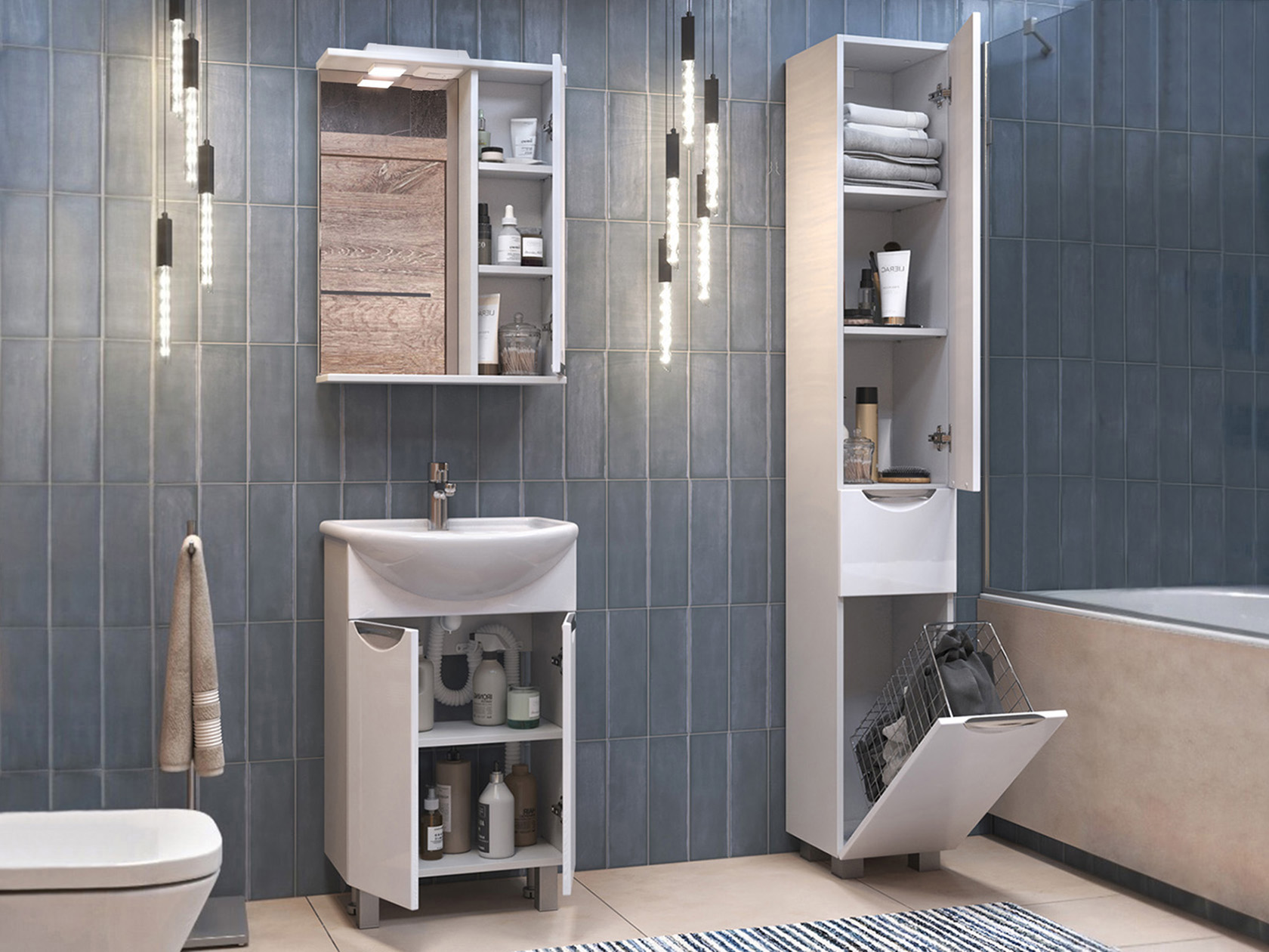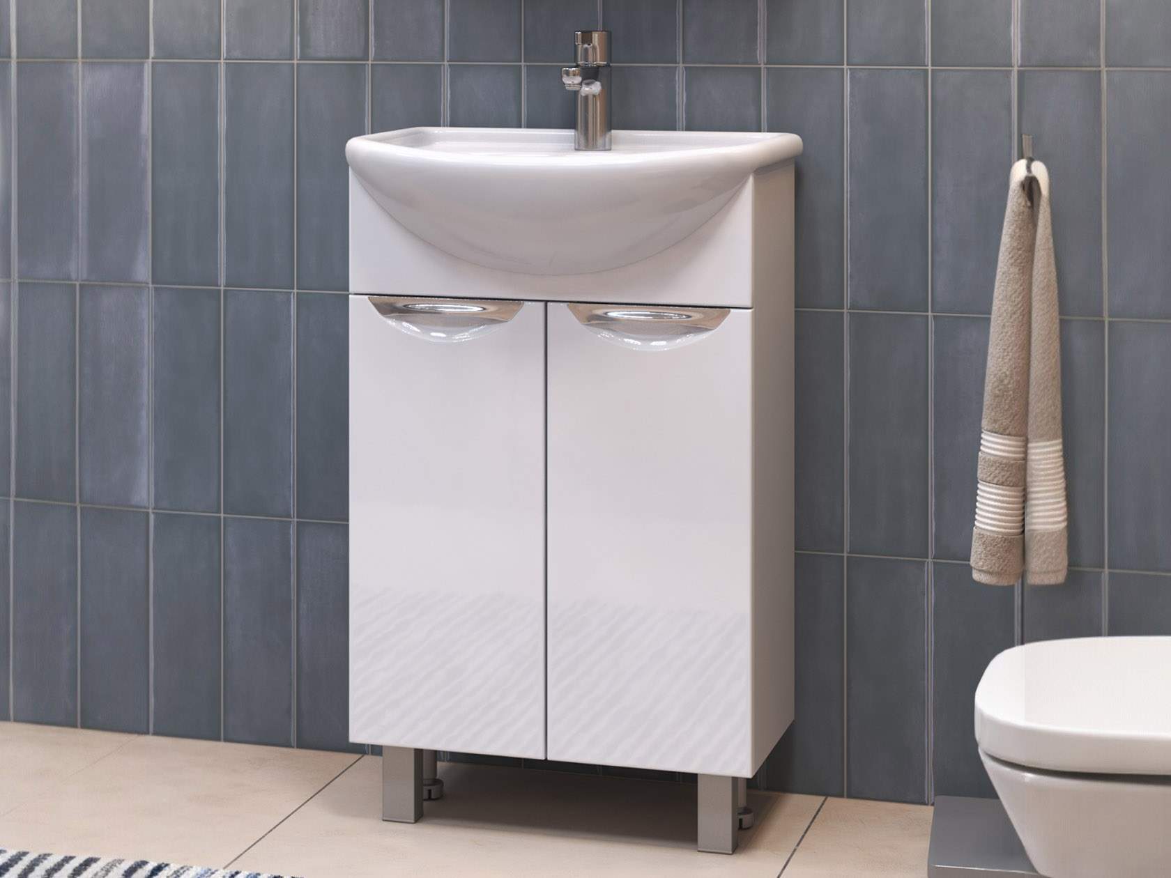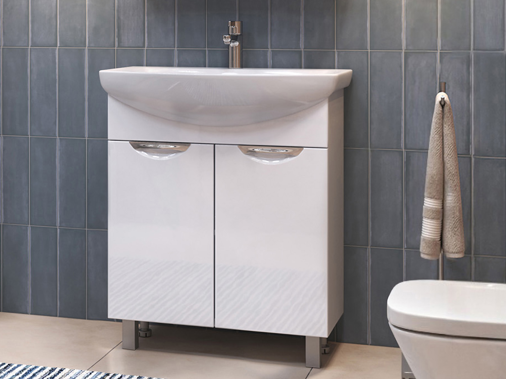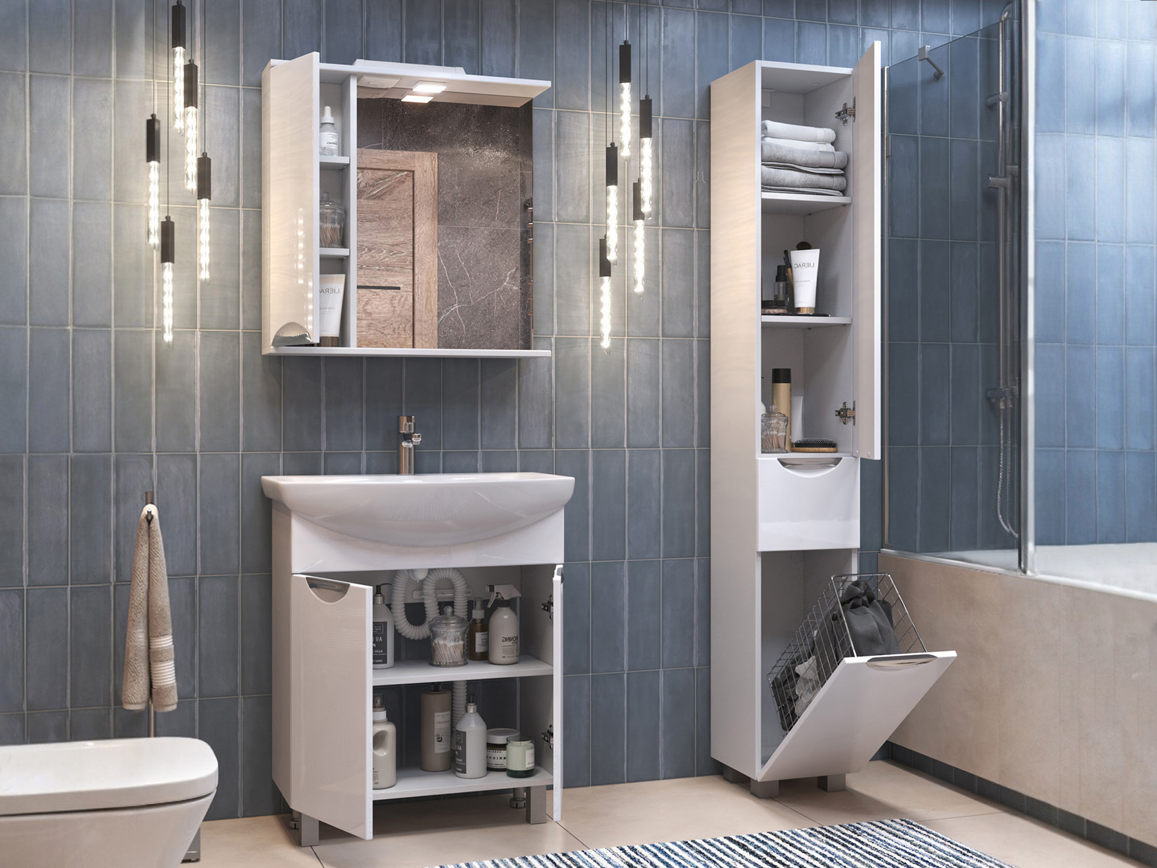 Регулируемые опоры обеспечивают устойчивость на полу с неровностями. Глянцевые фасады отлично выдерживают воздействие влаги и надолго сохраняют презентабельный вид. Хромированные ручки из металла выступают необычными акцентами пространства.