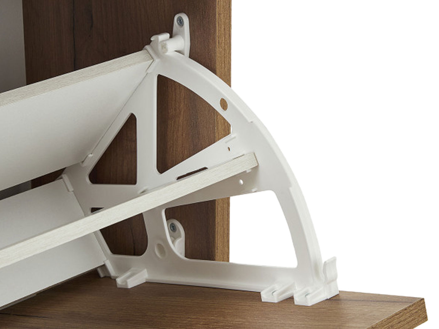 Благодаря небольшой глубине модель поместится даже в ограниченном пространстве. Удобные секции с откидными дверцами позволяют аккуратно хранить туфли, ботинки и кроссовки. Лаконичный дизайн без лишних деталей гармонично дополнит современный интерьер.