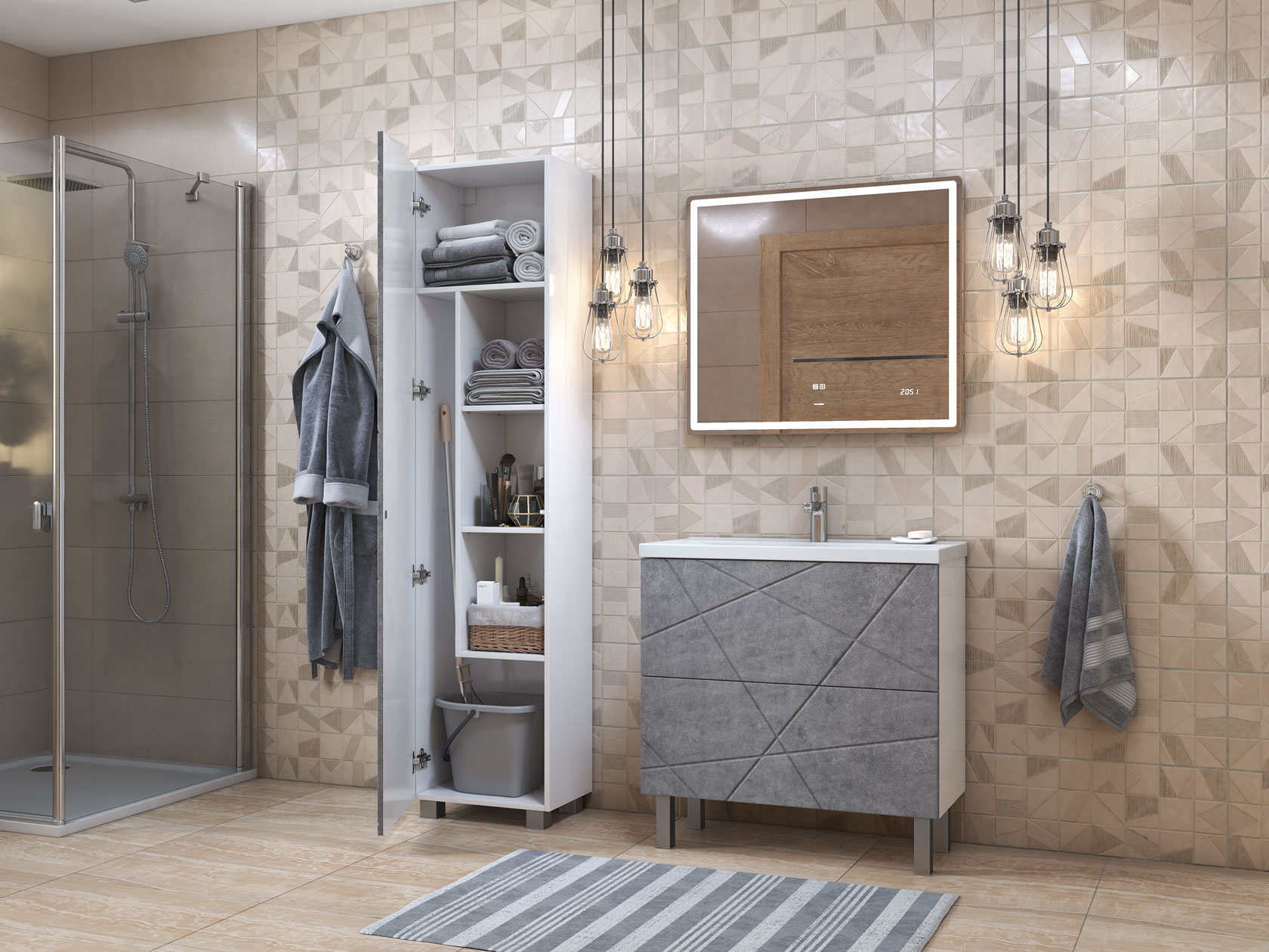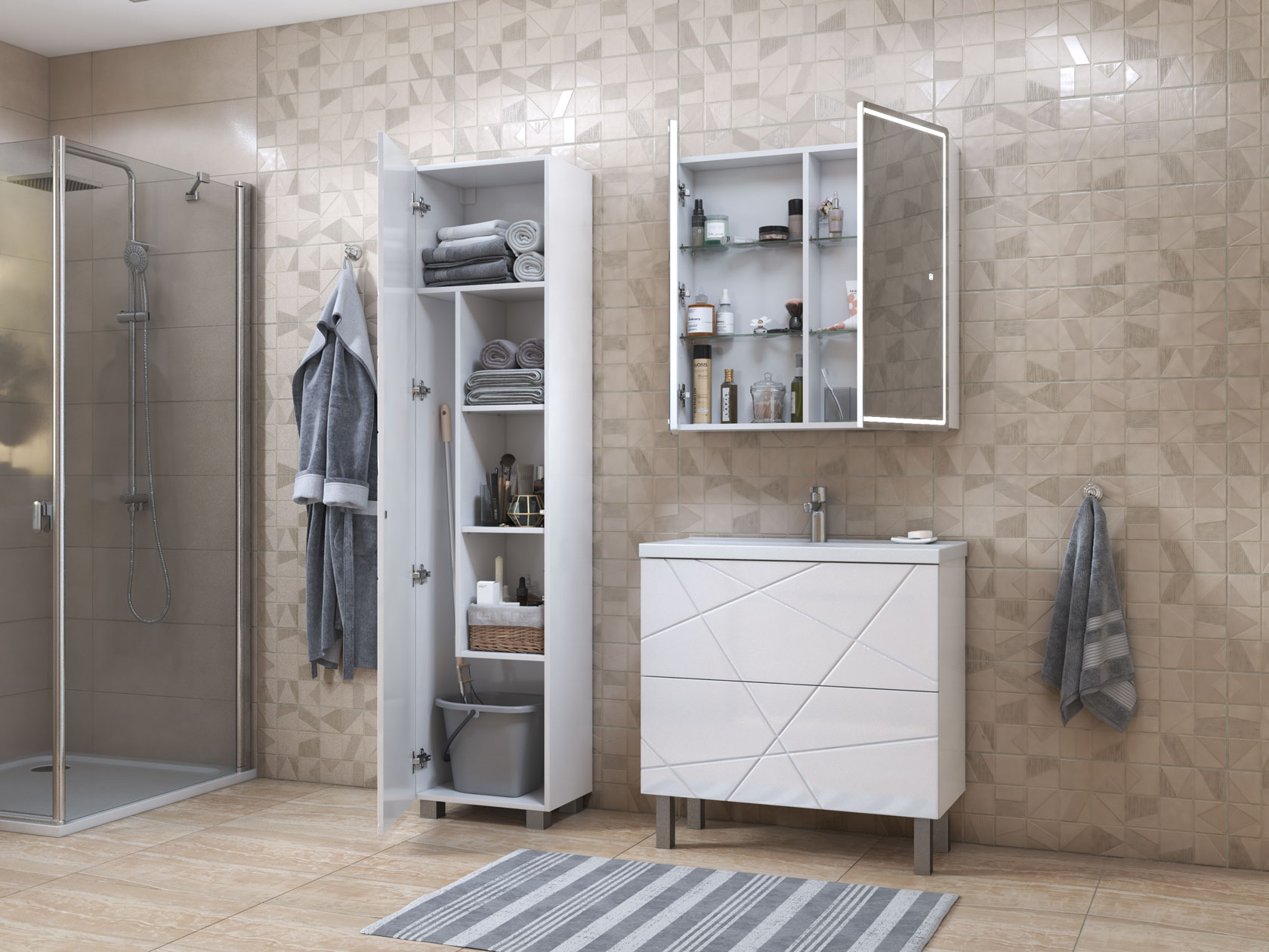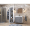 Фасад с трендовым узором придает мебели эффектный вид, а влагостойкие материалы обеспечивают долговечность. Внутри предусмотрены полки для хранения полотенец, бытовой химии или косметики. Регулируемые опоры дарят конструкции устойчивость и облегчают уборку.