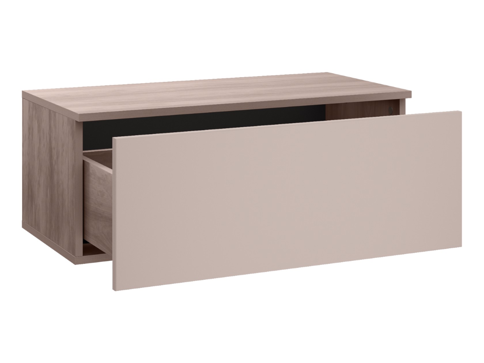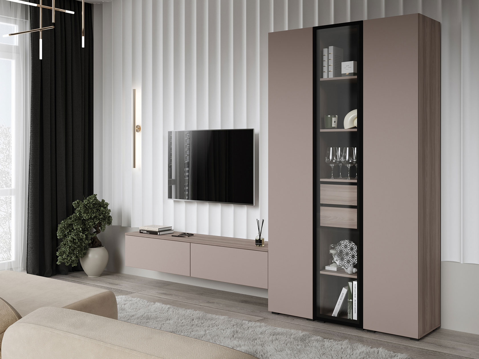 Функциональный набор элементов позволяет найти место для мультимедиа-системы и другой техники, а также аккуратно хранить книги, документы и предметы декора. За гладкими фасадами без выступающей фурнитуры легко ухаживать.