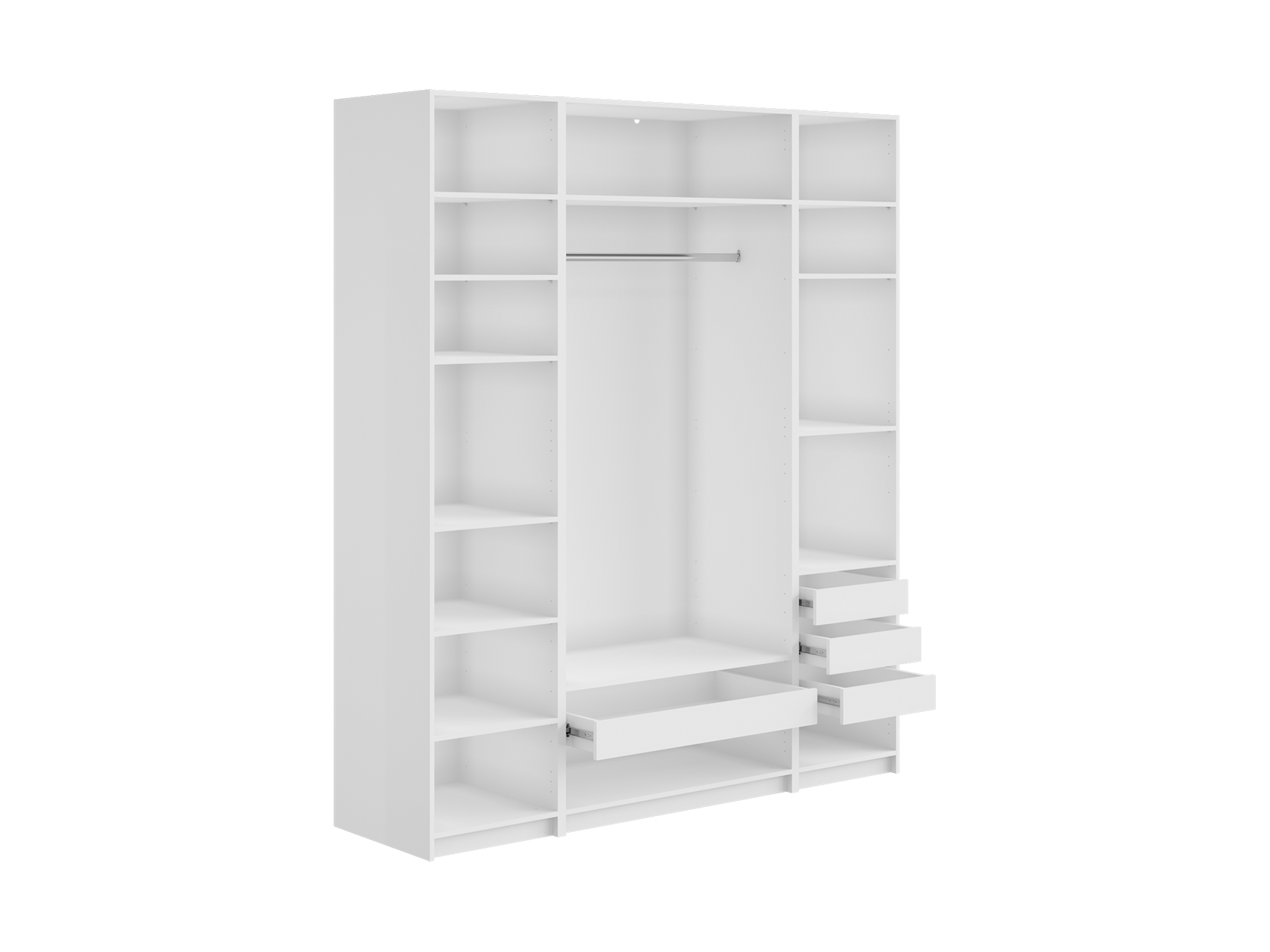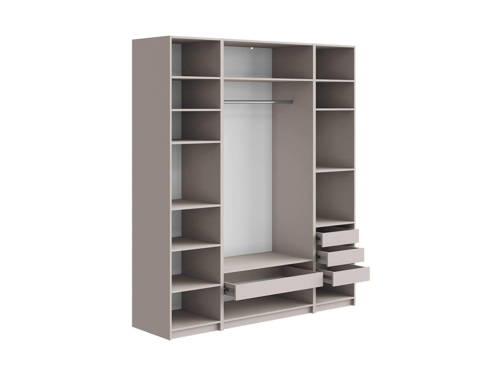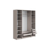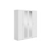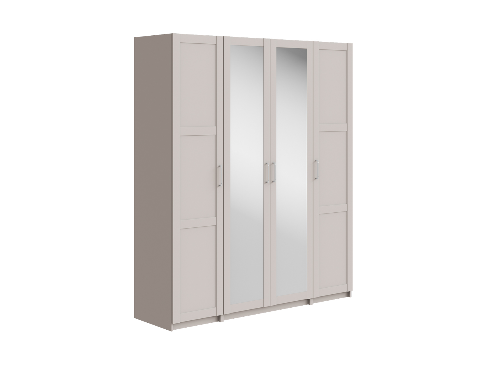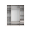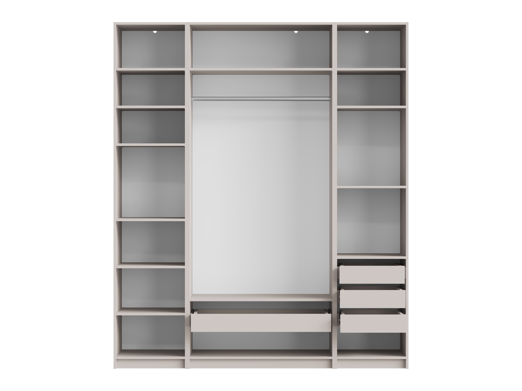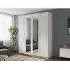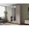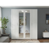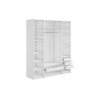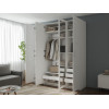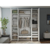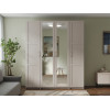 Светлые матовые фасады украшены декоративными рамками и в сочетании с зеркальными дверцами визуально расширяют пространство. Внутри конструкция оснащена полками, штангой для одежды и выдвижными ящиками, что позволяет легко поддерживать порядок и быстро находить необходимые вещи.