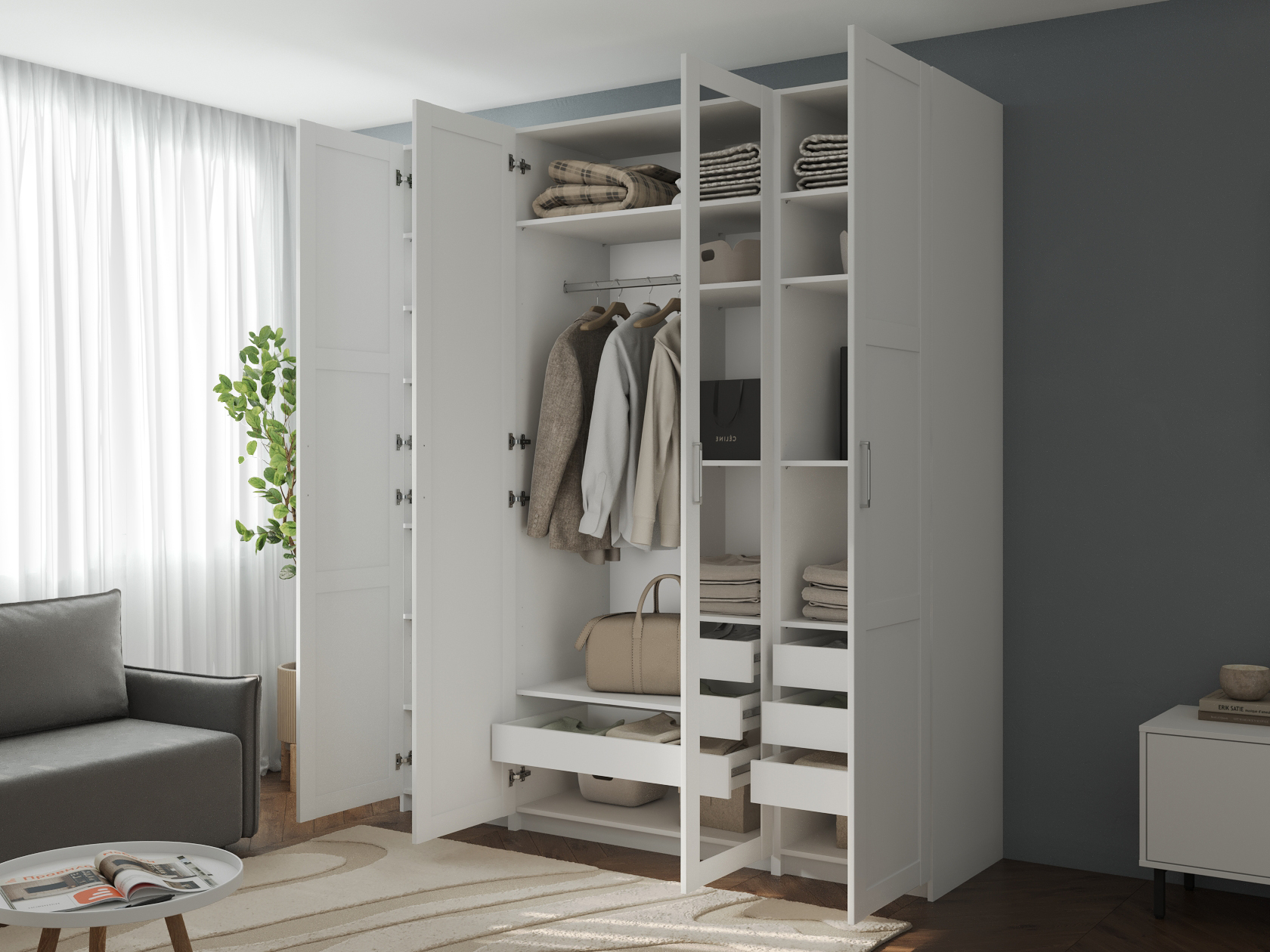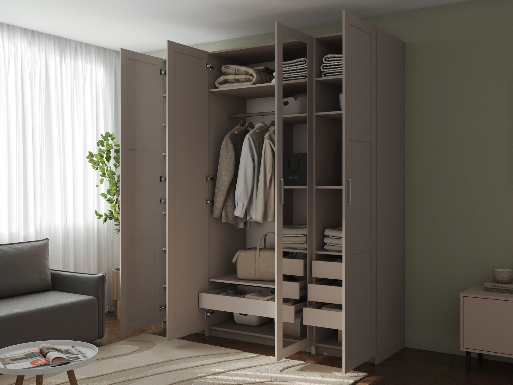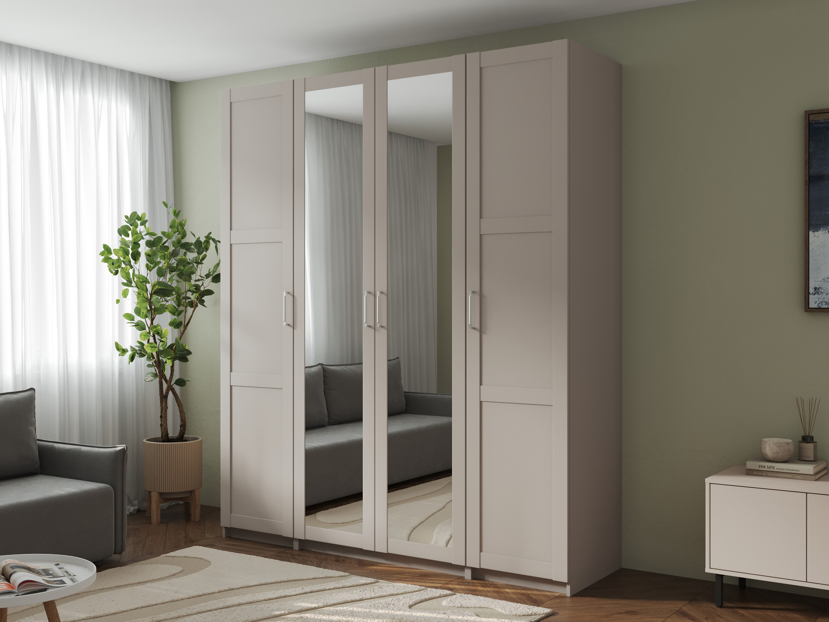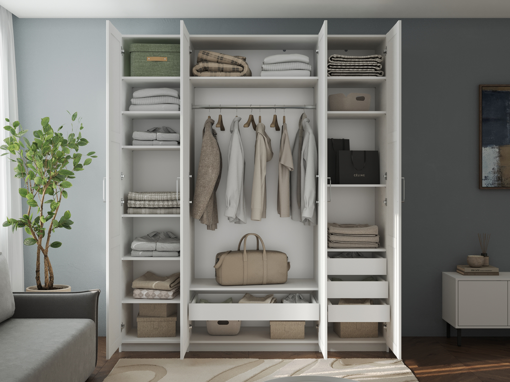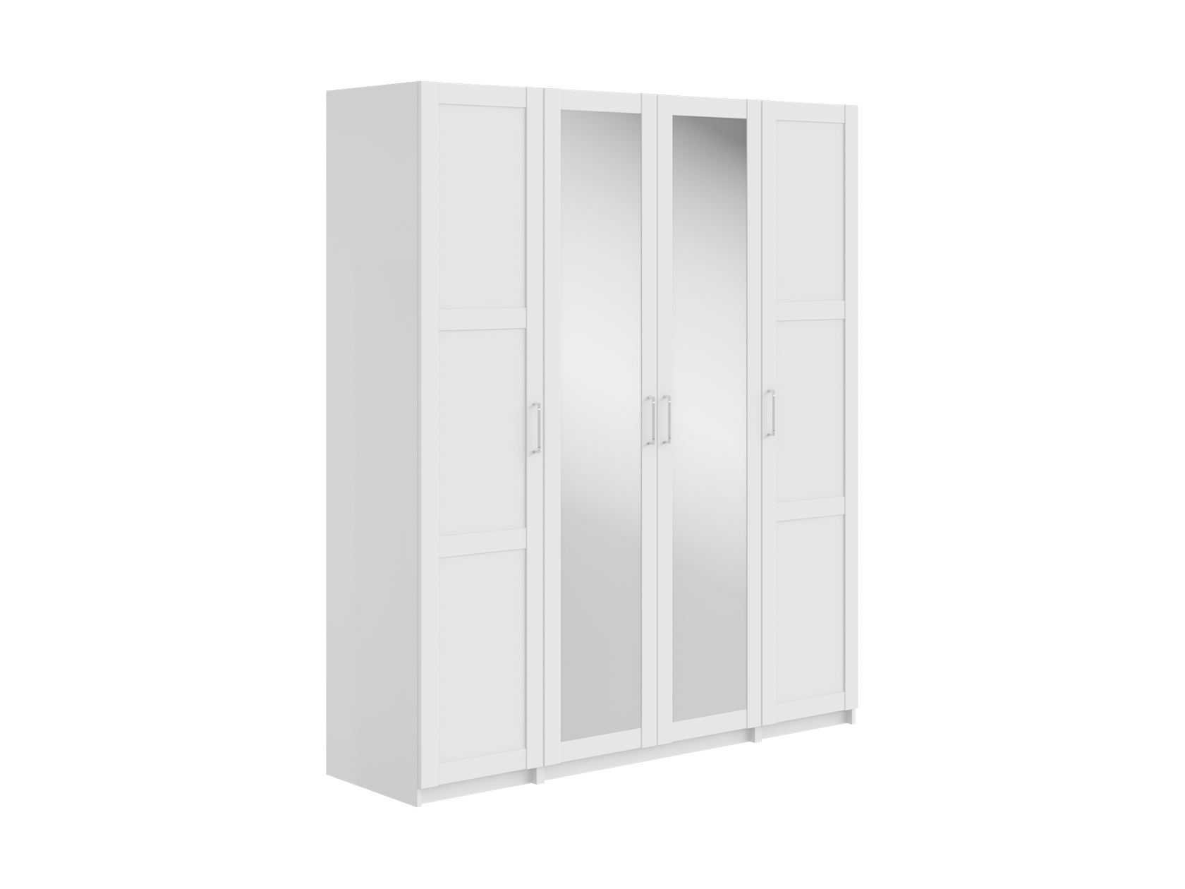 Светлые матовые фасады украшены декоративными рамками и в сочетании с зеркальными дверцами визуально расширяют пространство. Внутри конструкция оснащена полками, штангой для одежды и выдвижными ящиками, что позволяет легко поддерживать порядок и быстро находить необходимые вещи.