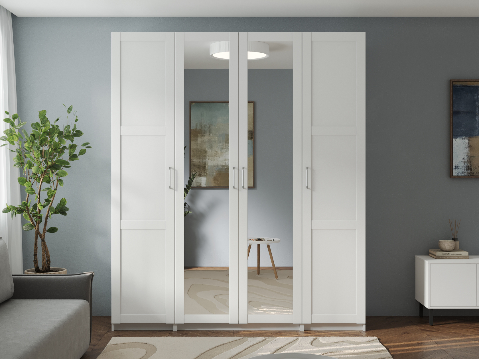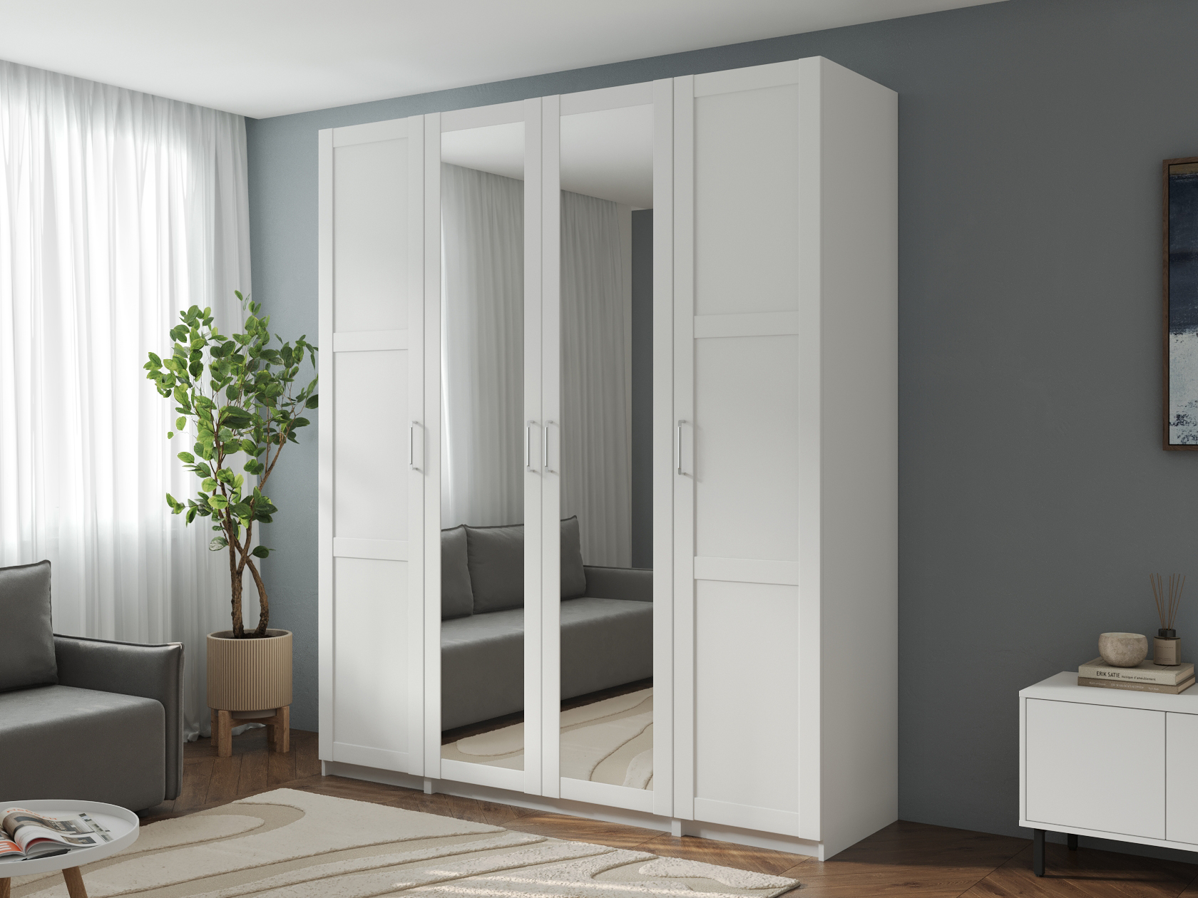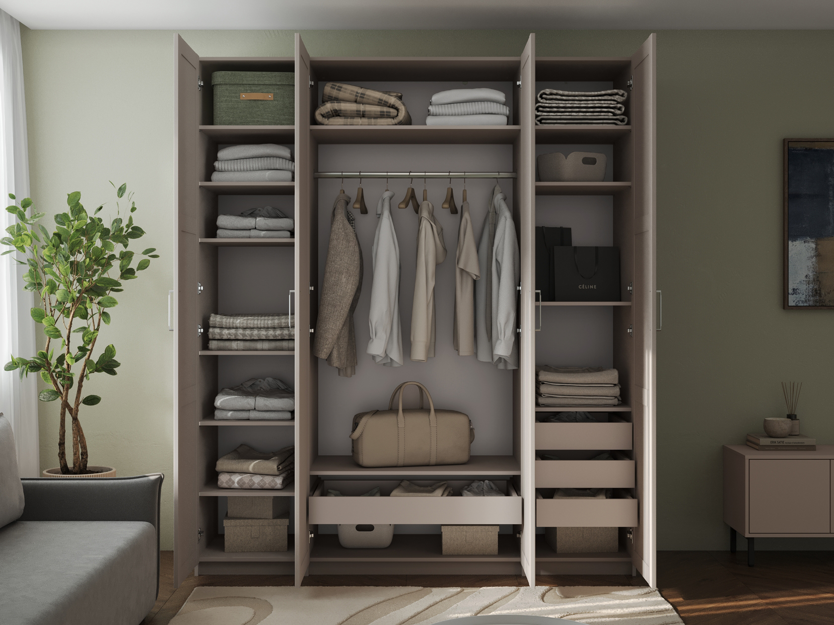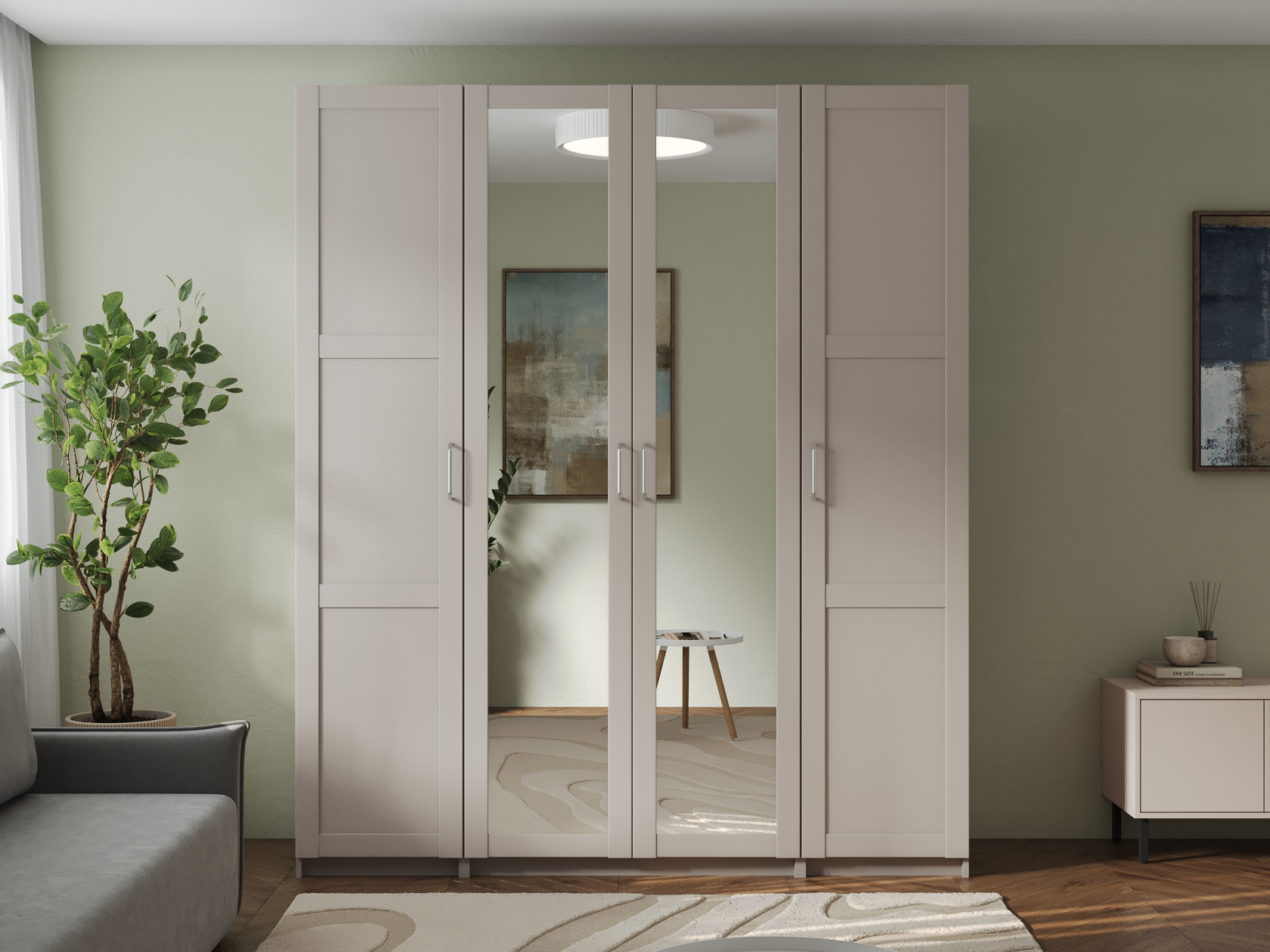 Светлые матовые фасады украшены декоративными рамками и в сочетании с зеркальными дверцами визуально расширяют пространство. Внутри конструкция оснащена полками, штангой для одежды и выдвижными ящиками, что позволяет легко поддерживать порядок и быстро находить необходимые вещи.