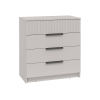 Просторные ящики бесшумно и плавно выдвигаются на всю глубину, позволяя без труда находить нужную вещь. На поверхности можно установить ночник, небольшой телевизор или предметы декора. Фасады дополнены узкими контрастными ручками и рифленой фрезеровкой в верхней части, что придает мебели актуальный и динамичный облик.