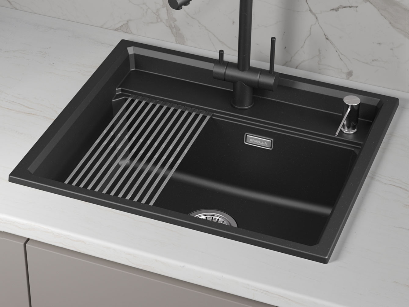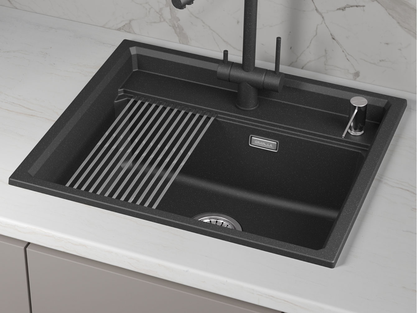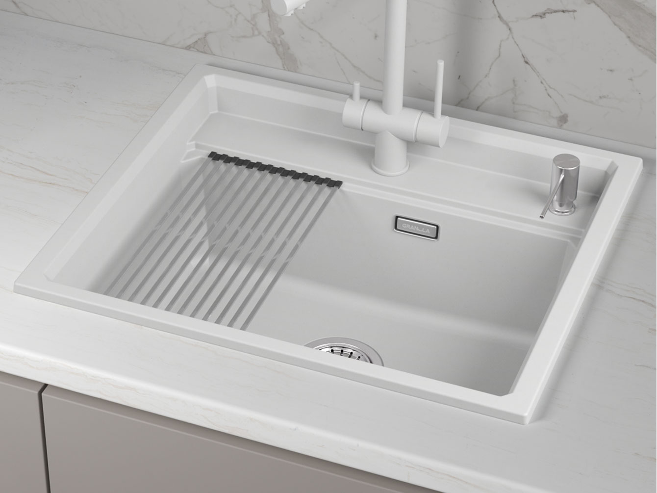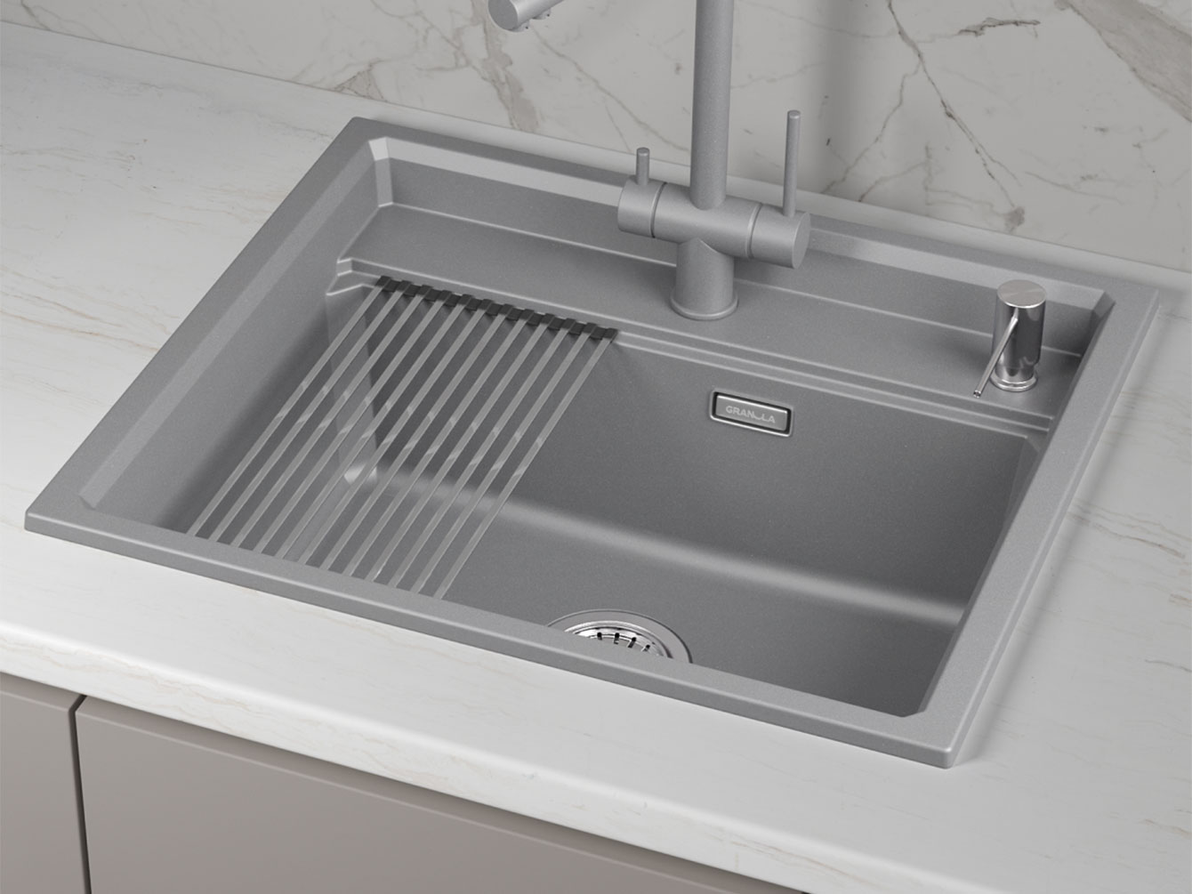 Удобная чаша квадратной формы адаптирована для ролл-мата и устойчива к царапинам, механическим ударам и пятнам. Аксессуар идеально прилегает к столешнице, перелив защищает от протечек. Кварцевый материал гарантирует долгий срок службы и эксплуатацию без нареканий.