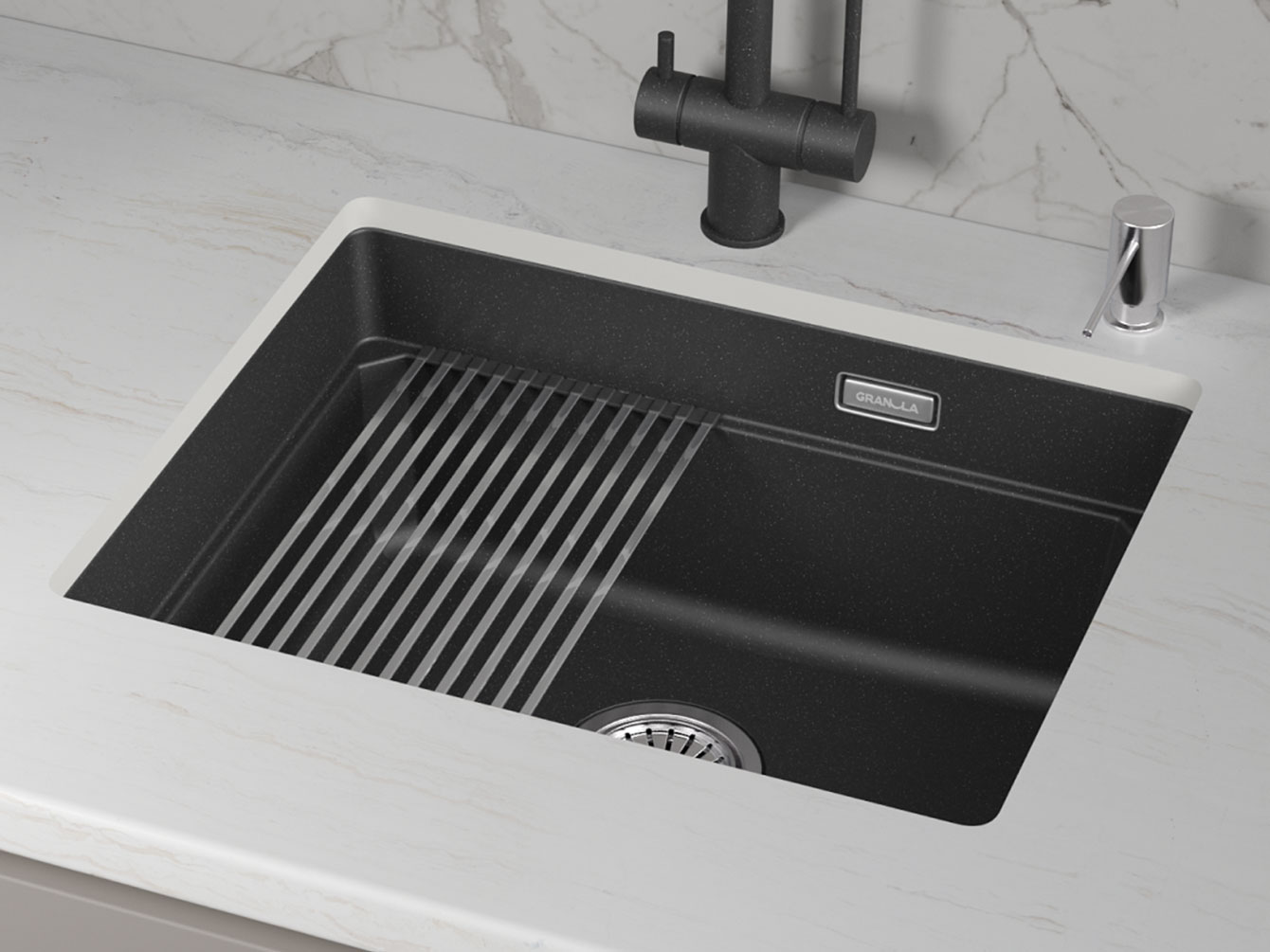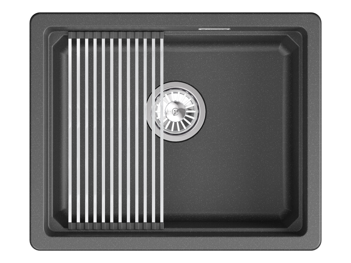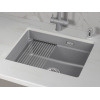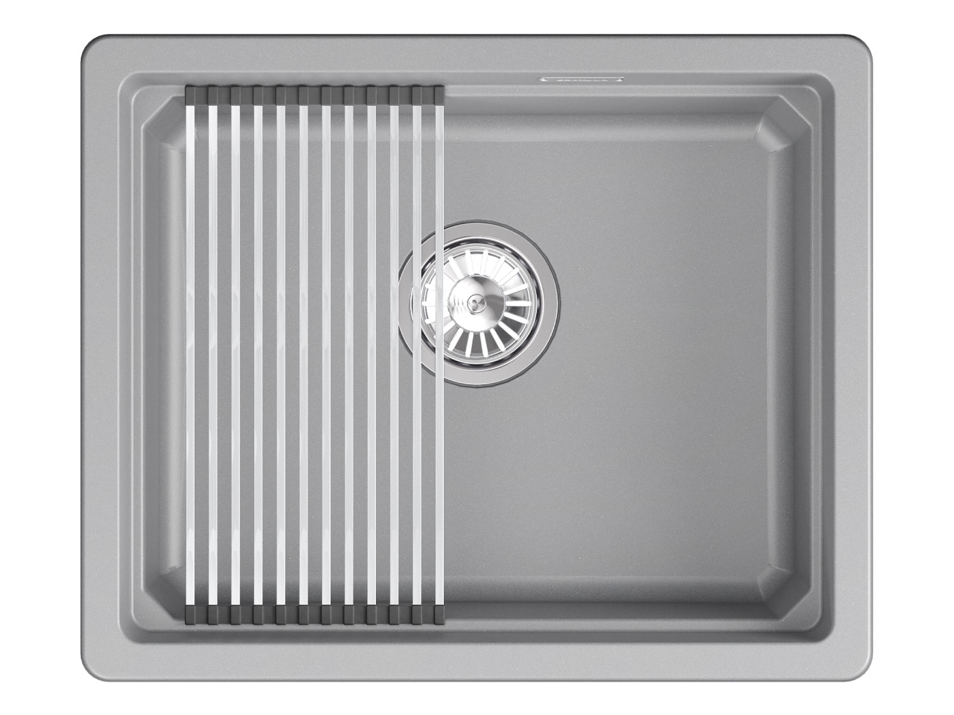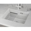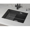 Композитный кварц высокой плотности обеспечивает надежную эксплуатацию на долгие годы. Инновационная конструкция включает удобную площадку для расположения внутри чаши ролл-мата или разделочной доски. Прямоугольный перелив гарантирует безопасность при случайном переполнении воды.