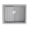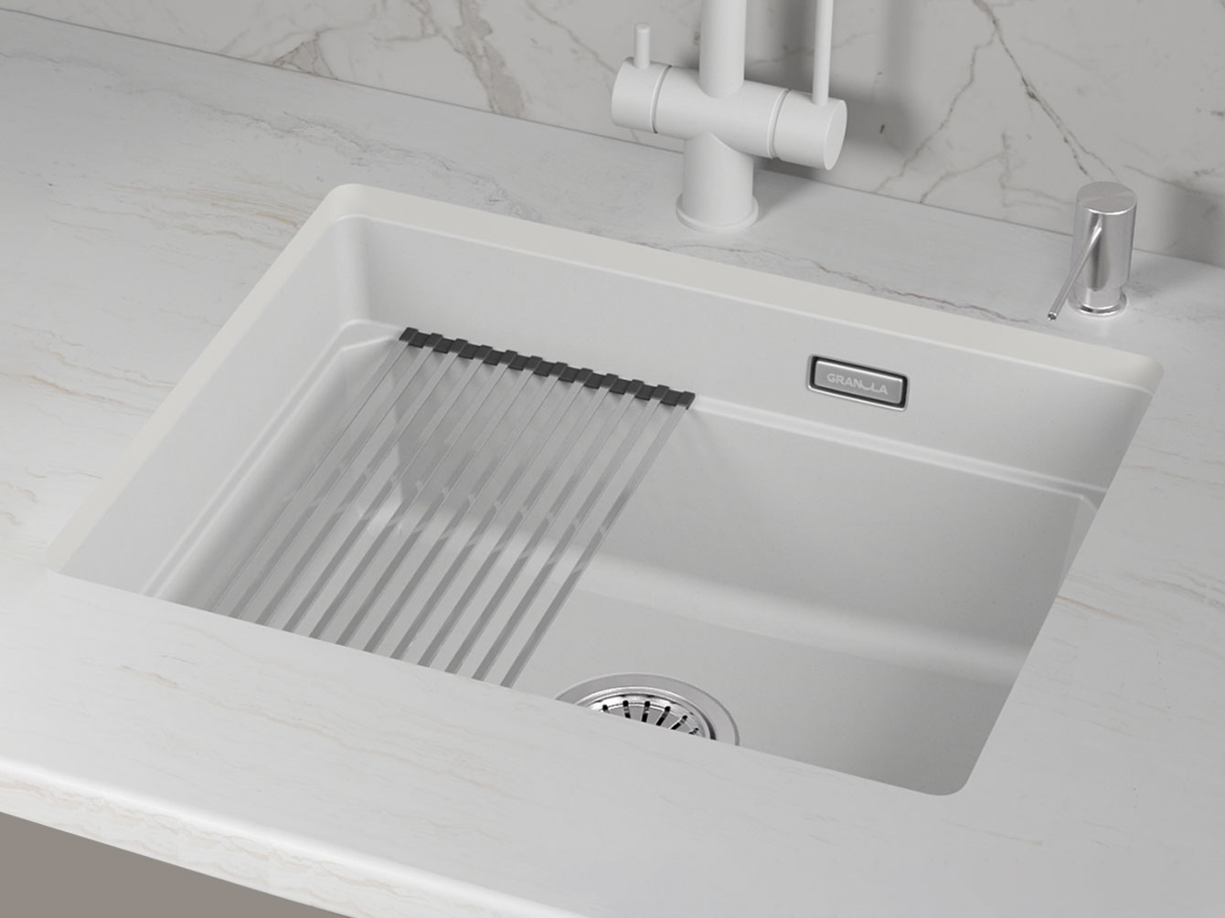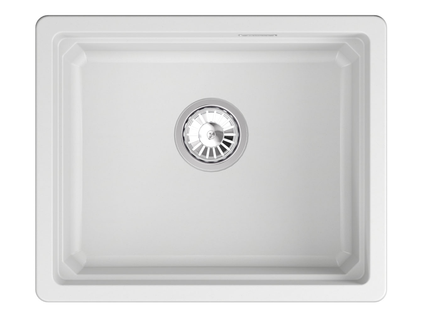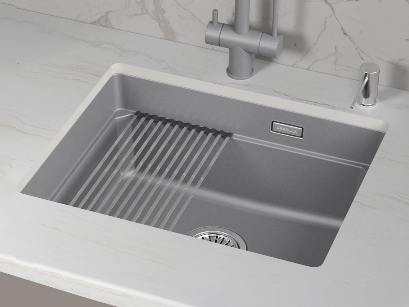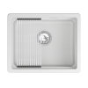Композитный кварц высокой плотности обеспечивает надежную эксплуатацию на долгие годы. Инновационная конструкция включает удобную площадку для расположения внутри чаши ролл-мата или разделочной доски. Прямоугольный перелив гарантирует безопасность при случайном переполнении воды.